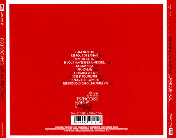 Françoise Hardy: L'amour Fou Die Version auf CD in Standard- Auflage. Diese besondere Auflage wurde veröffentlicht in Frankreich im Verlag Virgin am 13. November 2012. Album Genres übergreifend Pop, Ballade und Chanson.