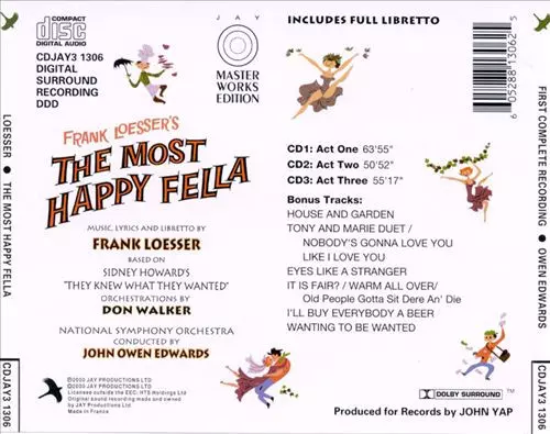Frank Loesser: The Most Happy Fella - First Complete Recording Die Version auf 3CD in Standard- Auflage. Diese besondere Auflage wurde veröffentlicht in Frankreich im Verlag Jay Productions Ltd. In Zusammenarbeit mit Jay Masterworks Edition am 8. August 2000. Album Genres übergreifend Stage & Screen und Musical.