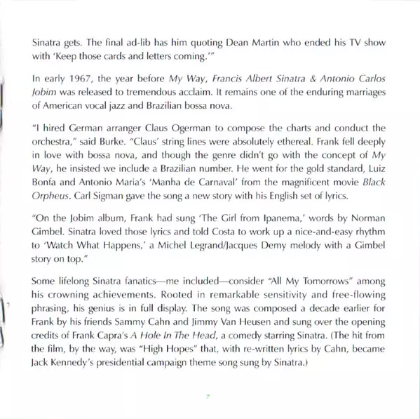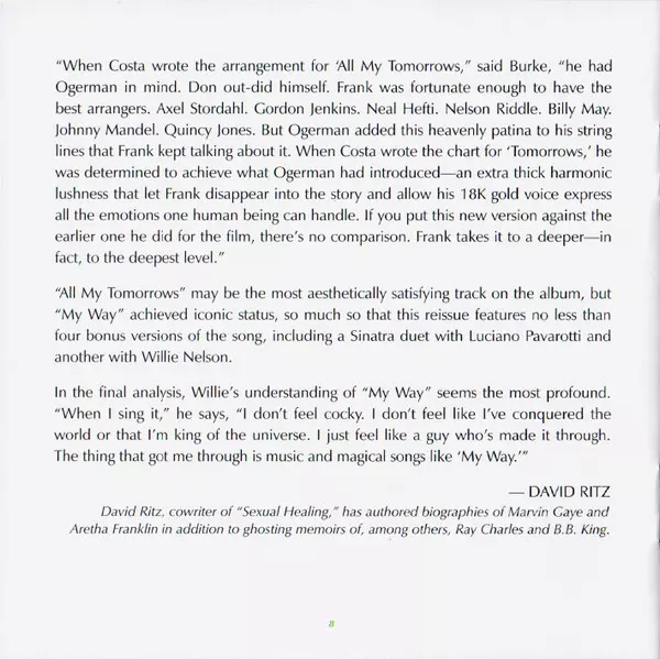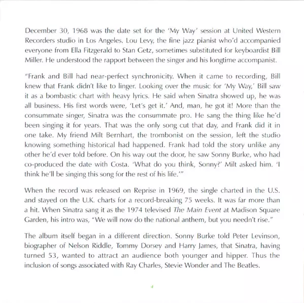 Celebrating the 50th anniversary of one of the most iconic recordings of all time! Reissued for the first time in decades is the album My Way, first issued in 1969 and featuring the hit title song as well as Sinatra's indelible performance on „All My Tomorrows,” from the film in which he had a starring role, A Hole In The Head. My Way, arranged by Don Costa, and coproduced by him with Sonny Burke, also includes Sinatra's versions of more contemporary material, from The Beatles' „Yesterday” to Simon & Garfunkel's „Mrs. Robinson.” My Way gets the expanded treatment for CD, which adds two rare duet versions - from the acclaimed Duets sessions but previously available only in limited form - and two live versions from successive decades. The CD package includes an exclusive, brand new essay by author David Ritz, known for his awardwinning artist biographies.