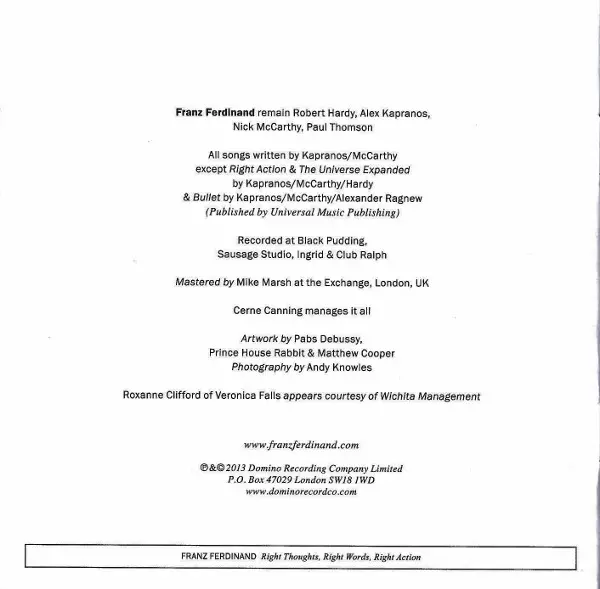 Franz Ferdinand: Right Thoughts, Right Words, Right Action Die Version auf CD in Standard- Auflage. Diese besondere Auflage wurde veröffentlicht in Europa im Verlag Domino am 27. August 2013.