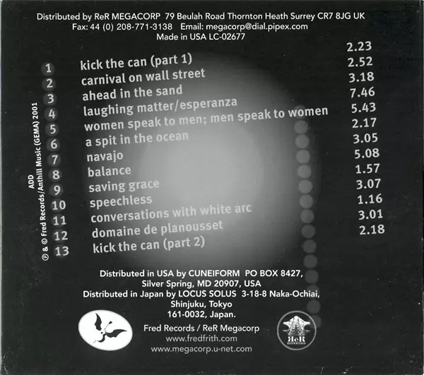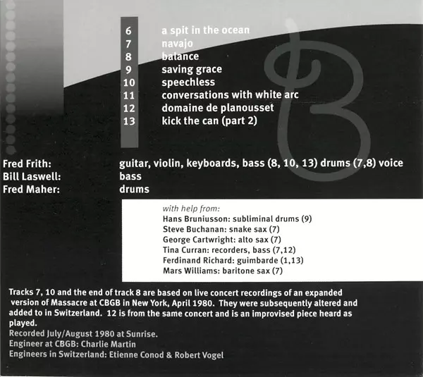Bass Bill Laswell | Drums Fred Maher | Keyboards, Voice Fred Frith | Recorder, Bass Tina Curran
