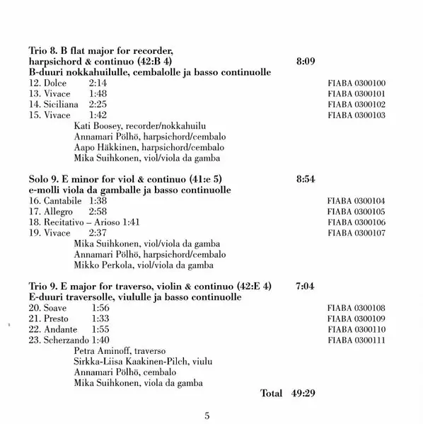 | Trio 9. E Major For Traverso, Violin & Continuo (42:E 4) | 7:04 min | |