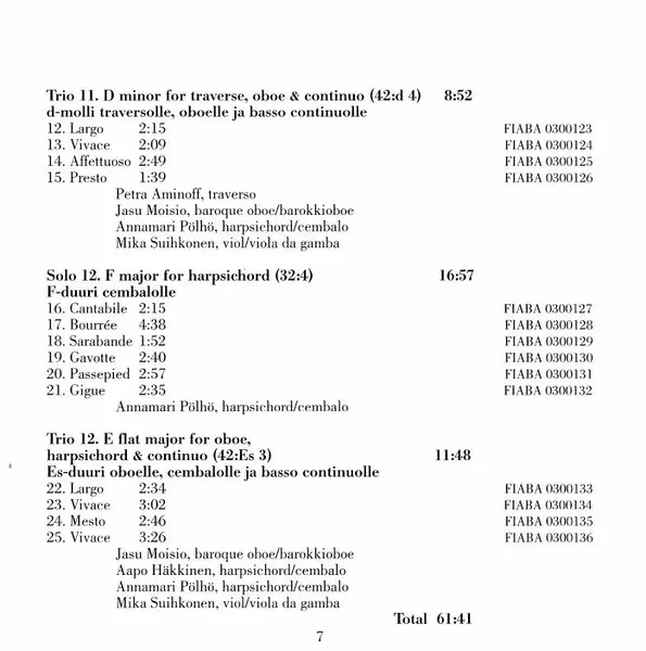 | Harpsichord Aapo Häkkinen, Annamari Pölhö | Oboe [Baroque Oboe] Jasu Moisio | Viola da Gamba Mika Suihkonen | ||