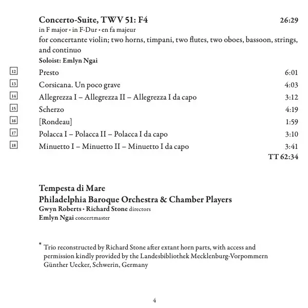 Concerto-Suite, TWV 51: F4 In F Major • In F-Dur • En Fa Majeur For Concertante Violin; Two Horns, Timpani, Two Flutes, Two Obo | 26:29 min |