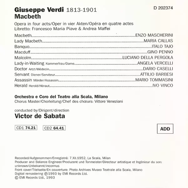 | Künstler | Giuseppe Verdi | Maria Callas | Victor De Sabata | Gino Penno | Italo Tajo | Enzo Mascherini |