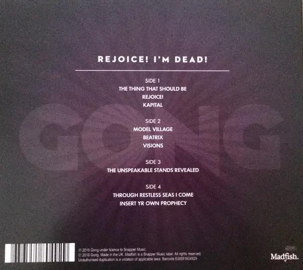 Gong: Rejoice! I'm Dead! Die Version auf CD in Standard- Auflage. Diese besondere Auflage wurde veröffentlicht in Europa und UK im Verlag Madfish am 14. Juni 2021. Album Genres übergreifend Rock, Progressive rock und Psychedelic rock.