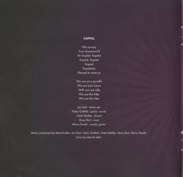 Acoustic Bass, Bass [Hi Bass EBow] Dave Sturt | Piano Chris Ellis (16) | Tenor Saxophone Ian East | Vocals Daevid Allen