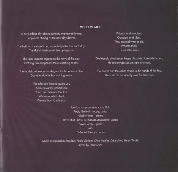 Bass, Vocals Dave Sturt | Drums, Vocals Cheb Nettles | Guitar, Guitar [Gliss] Fabio Golfetti | Soprano Saxophone, Tenor Saxophone Ian East | Vocals, Guitar Kavus Torabi