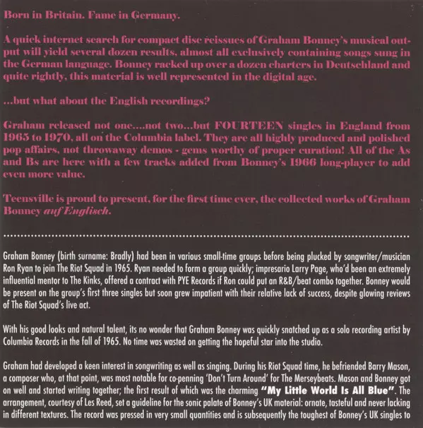 Graham Bonney: Thank You Baby: The Complete UK Pop Singles & More 1965-1970 Die Version auf CD in remastered Auflage. Diese besondere Auflage wurde veröffentlicht in Australien im Verlag Teensville Records am 28. Mai 2021. Album kann als folgendes Genre klassifiziert werden Pop. The Complete Uk Pop Singles & More.