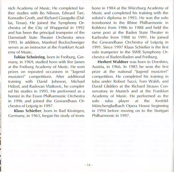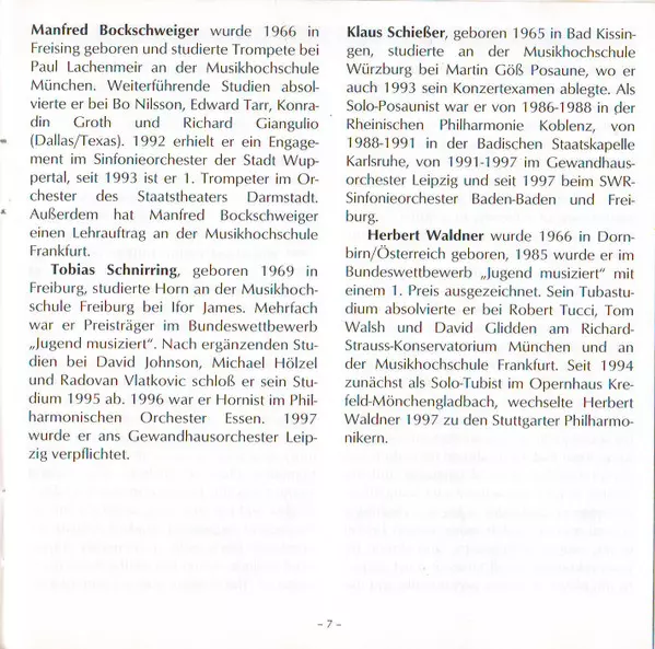 Horn Tobias Schnirring | Trombone Klaus Schießer | Trumpet Johannes Sondermann, Manfred Bockschweiger | Tuba Herbert Waldner |