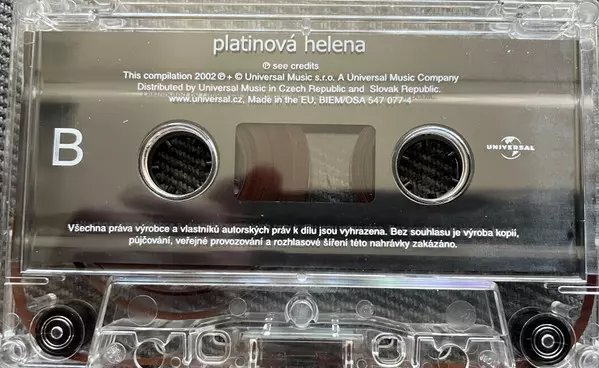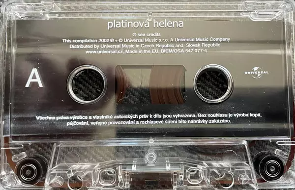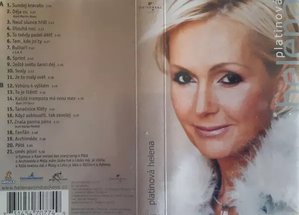 Helena Vondráčková: Platinová Helena Die Version auf MC in Standard- Auflage. Diese besondere Auflage wurde veröffentlicht in Tschechische Republik und Slowakei im Verlag Universal In Zusammenarbeit mit Bon Art Music am 11. November 2002. Album Genres übergreifend Pop, Vokalmusik, Ballade, Disco und Tschechoslowakische Klassiker.