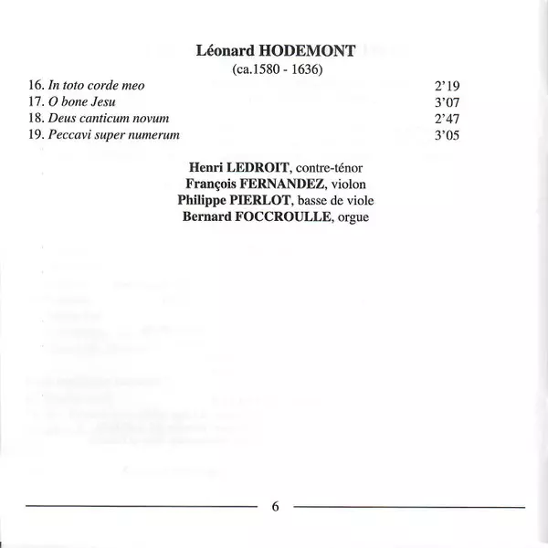 Künstler | Choeur de Chambre de Namur | Ensemble La Fenice | Jean Tubéry | Ricercar Consort | Bernard Foccroulle | Henry Dumont | Gérard Lesne | Henri Ledroit | Gilles Henri Hayne |