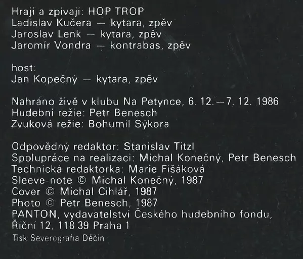 Hop Trop ist eine tschechische Folk- und Countryband, die 1976 von ihrem Leiter, Sänger und Gitarristen Jiří Tichota gegründet wurde, der zuvor Mitglied der legendären tschechischen Folkgruppe "Spirituál kvintet" war. Die Musik der Band zeichnet sich durch eine Mischung aus traditi...