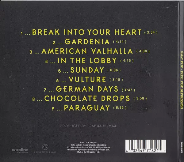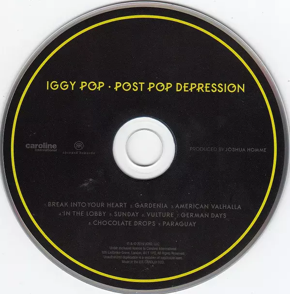 Iggy Pop: Post Pop Depression Die Version auf CD in Standard- Auflage. Diese besondere Auflage wurde veröffentlicht in Europa im Verlag Caroline International In Zusammenarbeit mit Rekords Rekords am 18. März 2016.