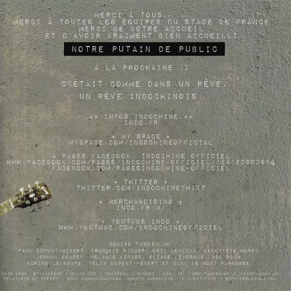 Indochine: Putain De Stade Die Version auf 2CD in Standard- Auflage. Diese besondere Auflage wurde veröffentlicht in Kanada im Verlag Tandem.mu am 29. März 2011. Album Genres übergreifend Rock, Elektronische Musik, New Wave und Pop Rock.