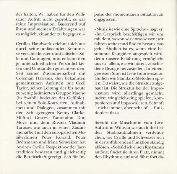 | Künstler | Andrew Cyrille | Irene Schweizer |