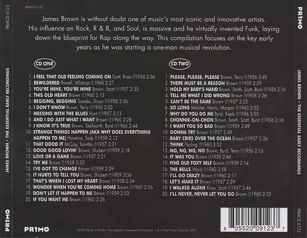 James Brown: The Essential Early Recordings Die Version auf 2CD in remastered Auflage. Diese besondere Auflage wurde veröffentlicht in Europa im Verlag Primo (2) am 9. August 2011. Album Genres übergreifend Funk / Soul, Rhythmus und Blues und Soul.