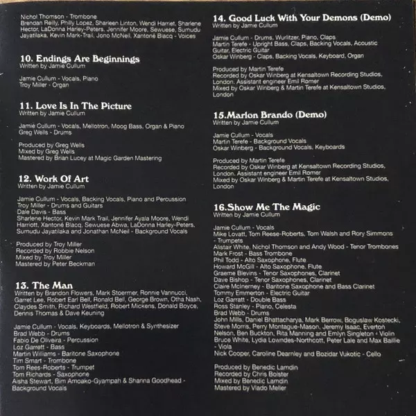 Bass Loz Garratt | Drums Brad Webb | Guitar Femi Towowo | Organ Troy Miller | Tenor Saxophone, Baritone Saxophone Tom Richards (5) | Trombone Nichol Thomson | Trumpet Rory Simmons, Tom Rees-Roberts | Vocals, Electric Piano [Wurlitzer] Jamie Cullum | Written-By Jamie Cullum, Jamie Hartman