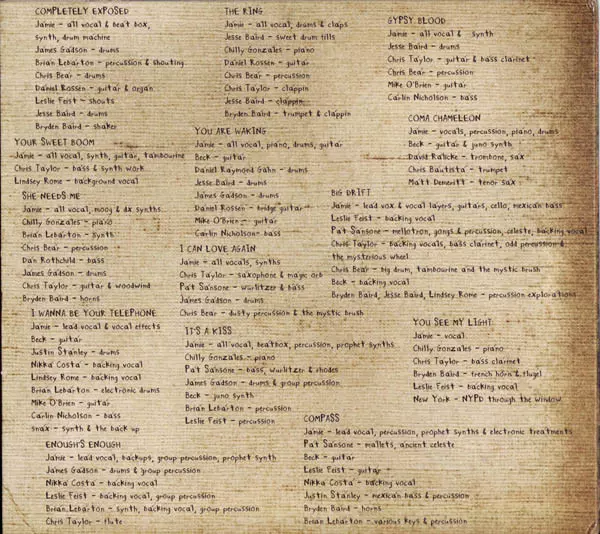 Drums Chris Bear, James Gadson, Jesse Baird | Guitar, Organ Daniel Rossen | Percussion Brian Lebarton | Shaker Bryden Baird | Vocals [All Vocal], Human Beatbox, Synth, Drum Machine Jamie Lidell | Vocals [Shouting] Brian Lebarton | Vocals [Shouts] Leslie Feist