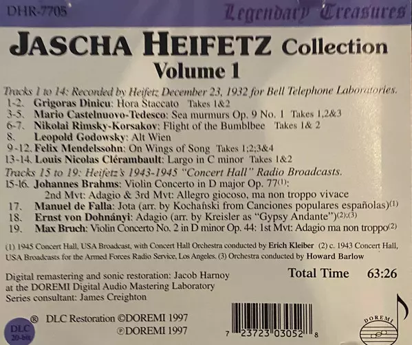 Jascha Heifetz: Collection Vol.1 Die Version auf CD in remastered Auflage. Diese besondere Auflage wurde veröffentlicht in USA im Verlag Doremi (2) am 22. April 1997. Album Genres übergreifend Klassische Musik, Barockmusik, Modernism und Romantik.