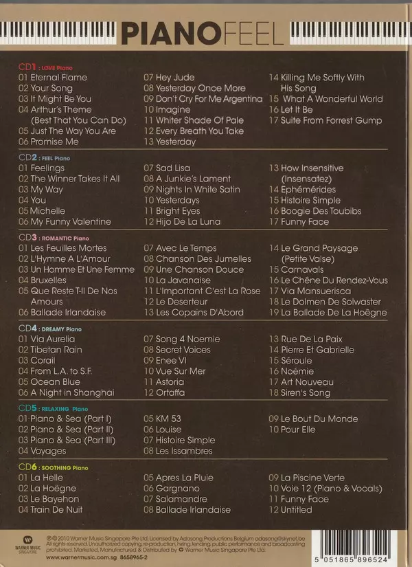 Jean-François Maljean: Piano Feel Die Version auf 6CD in Standard- Auflage. Diese besondere Auflage wurde veröffentlicht in Singapur im Verlag Warner Music Singapore am 11. September 2012. Album Genres übergreifend Pop, Klassische Musik, Folk, World, & Country, Elektronische Musik und New Age.