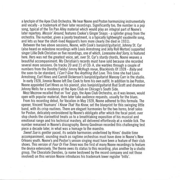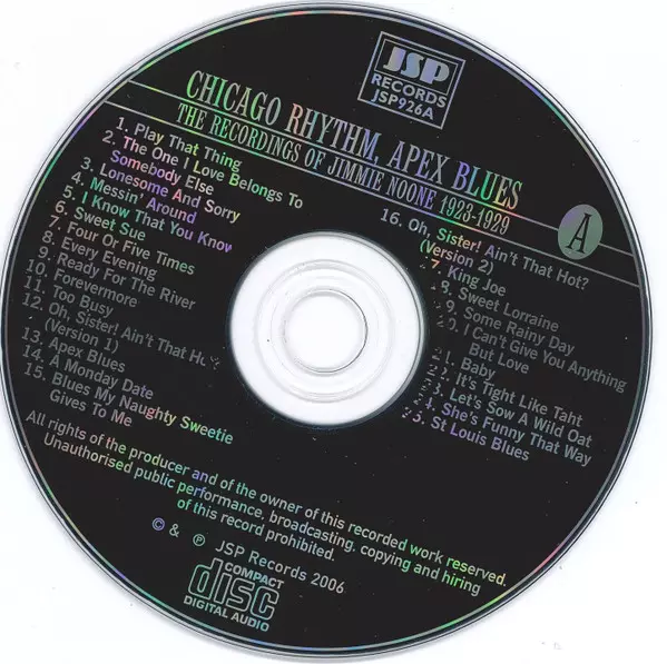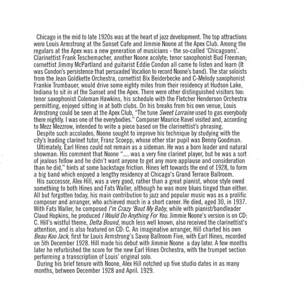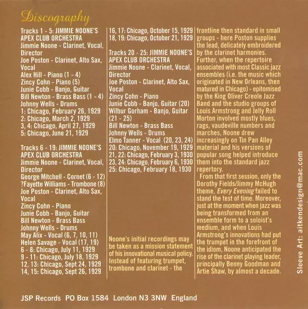 Jimmie Noone: Chicago Rhythm - Apex Blues (The Recordings Of Jimmie Noone 1923-1943) Die Version auf 4CD in Standard- Auflage. Diese besondere Auflage wurde veröffentlicht in UK im Verlag JSP Records am 27. Juli 2006. Album Genres übergreifend Jazz, Swing und Dixieland.
