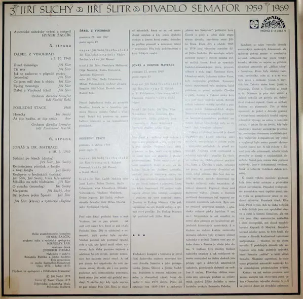 Jiří Suchý & Jiří Šlitr: Divadlo Semafor 1959 - 1969 (1-3) Die Version auf Vinyl 3LP in Standard- Auflage. Diese besondere Auflage wurde veröffentlicht in Tschechoslowakei im Verlag Supraphon Im Jahr 1978. Album Genres übergreifend Pop, Non-Music, Gesprochenes Wort, Chanson und Tschechoslowakische Klassiker.