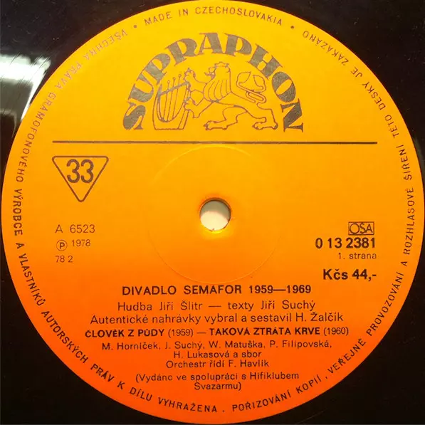 Leader [Řídí] Ferdinand Havlík | Orchestra Orchestr Divadla Semafor | Vocals Jiří Suchý, Waldemar Matuška