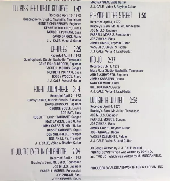 Bass Norbert Putnam | Drums Farrell Morris | Engineer Gene Eichelberger | Piano Bobby Wood | Voice, Guitar J.J. Cale