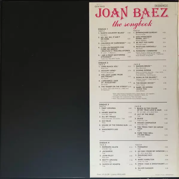 Joan Baez: The Songbook Die Version auf Vinyl 4LP/Box Set in Standard- Auflage. Diese besondere Auflage wurde veröffentlicht in Frankreich im Verlag Musidisc In Zusammenarbeit mit Vanguard Im Jahr 1977. Album Genres übergreifend Rock und Folk-Rock.