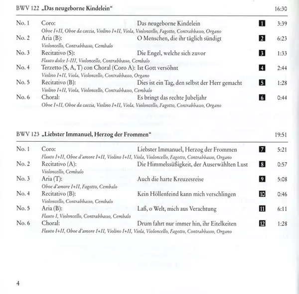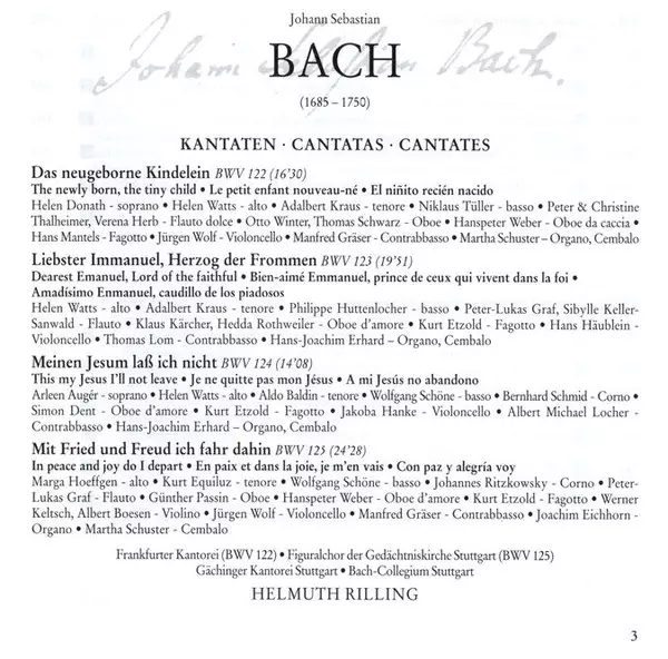 Johann Sebastian Bach: Cantatas BWV 122-125 Die Version auf CD in remastered Auflage. Diese besondere Auflage wurde veröffentlicht im Verlag Hänssler Classic am 27. Juni 2000. Album Genres übergreifend Klassische Musik, Choral und Cantata.