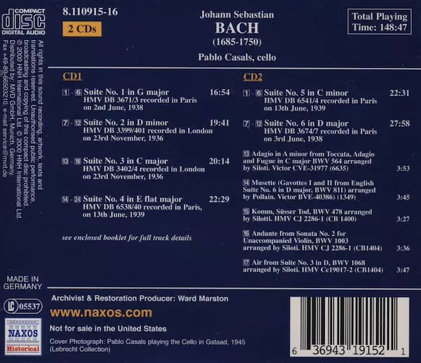 | Künstler | Johann Sebastian Bach | Pablo Casals |