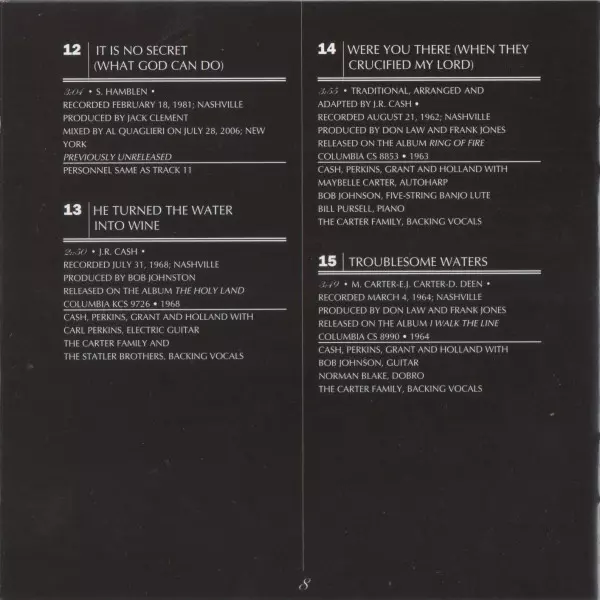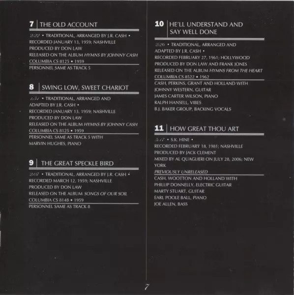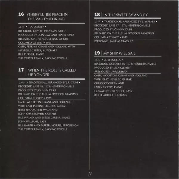 Arranged By Johnny Cash | Backing Vocals The Carter Family | Bass John Williams (8), Marshall Grant | Drums W.S. Holland | Electric Guitar Bob Wootton, Carl Perkins | Guitar Jerry Shook, Johnny Christopher, Pete Wade | Percussion Bill Harris (4), Farrell Morris | Piano Beegie Cruser, Bill Walker | Producer Johnny Cash | Vocals, Acoustic Guitar Johnny Cash | Written-By Traditional