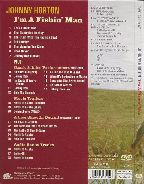 Johnny Horton: I'm A Fishin' Man CLR Die Version auf DVD in farbiger Auflage. Diese besondere Auflage wurde veröffentlicht in Deutschland im Verlag Bear Family Records am 30. August 2012. Album Genres übergreifend Rock, Folk, World, & Country, Country und Rockabilly.