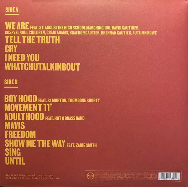 Backing Vocals [Background Vocals] Carol Hatchett, Roberta Freeman | Baritone Saxophone Jim Jedeiken | Bass Eliana Athayde | Cello Kevan Torfeh | Congas Andres Renteria | Drums James Gadson, Josh Adams (2) | Guitar Nick Waterhouse (2) | Producer [Produced By] Jon Batiste, Nick Waterhouse (2) | Recorded By [Sound City Studios] Joseph Lorge | Tenor Saxophone Ron Dziubla | Trumpet Mark Pender | Viola Kiara Ana Perico, Laurann Angel | Violin Koyo Kim, Michelle Tseng, Simone Deleon-Jones, Yu-Ting Wu | Vocals, Piano, Drum Machine Jon Batiste | Written-By Jon Batiste