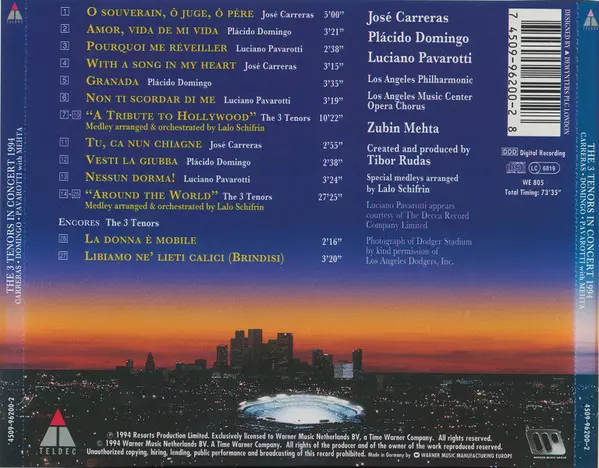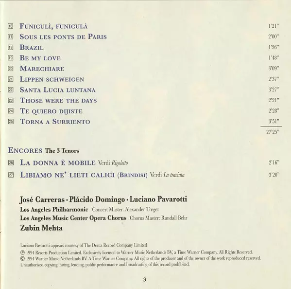 | Künstler | Luciano Pavarotti | Placido Domingo | José Carreras | Zubin Mehta |