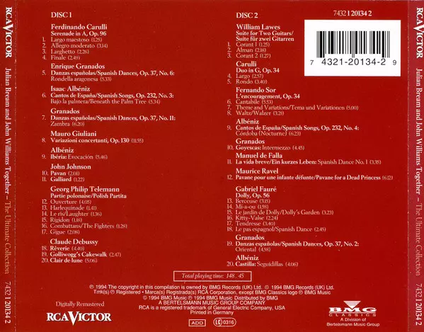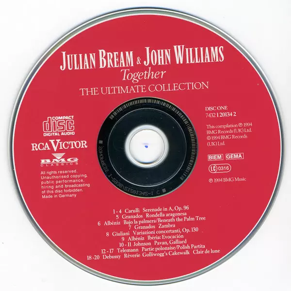John Williams: Together (The Ultimate Collection) Die Version auf 2CD in remastered Auflage. Diese besondere Auflage wurde veröffentlicht in UK im Verlag RCA Victor In Zusammenarbeit mit BMG Classics am 21. Mai 1994. Album Genres übergreifend Klassische Musik, Folk, World, & Country, Barockmusik, Modernism, Folk, Romantik, Impressionistic und Renaissance.