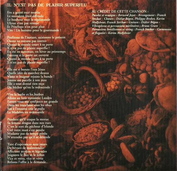 Arranged By Franck Steckar | Bagpipes, Flageolet Karim Medjebeur | Choir Didier Bégon, Franck Steckar, Karim Medjebeur, Philippe Brohet | Guitar Didier Bégon | Lyrics By, Music By Bernard Joyet | Percussion [Brazilian], Performer [Undercloths] Franck Steckar | Vibraphone, Percussion [Military Percussions] Bruno Grare