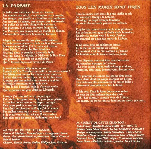 Bass Drum, Drum Bruno Grare | Bouzouki, Bass [Fretless] Didier Bégon | Flute, Clarinet, Bass Clarinet Philippe Brohet | Lyrics By Oscar-Vladislav de Lubicz-Milosz | Marimba, Timbales, Cymbal Franck Steckar | Music By, Arranged By Juliette Noureddine | Piano Karim Medjebeur