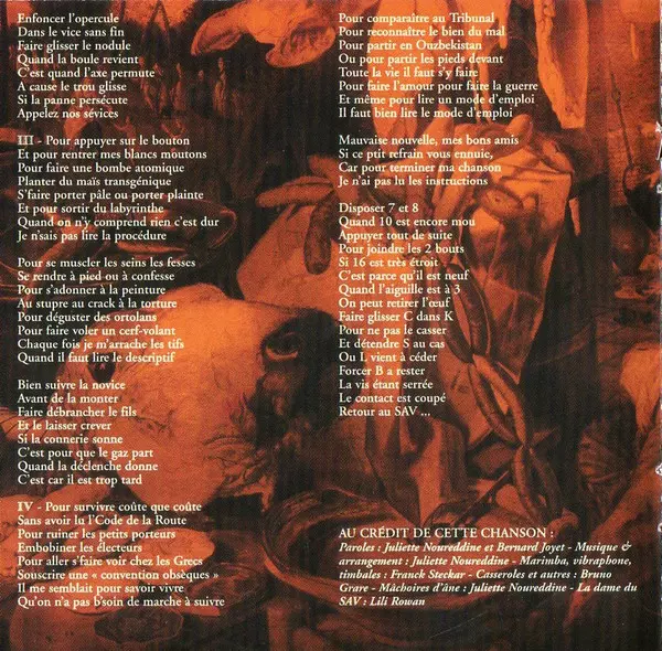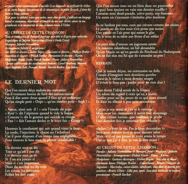 Accordion, Choir Franck Steckar | Choir [Additional] Bernard Joyet, François Réault, Lionel Groshény, Lyes Salem, Patrick Rivière, Stéphane Judé | Clarinet, Choir Philippe Brohet | Lute [Saz], Choir Didier Bégon | Lyrics By Bernard Joyet | Music By, Arranged By Juliette Noureddine | Percussion, Choir Bruno Grare, Franck Steckar, Karim Medjebeur | Piano Juliette Noureddine