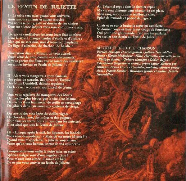 Juliette: Le Festin De Juliette Die Version auf CD in Standard- Auflage. Diese besondere Auflage wurde veröffentlicht in Frankreich im Verlag Polydor In Zusammenarbeit mit Universal am 9. April 2002. Album Genres übergreifend Pop und Chanson.