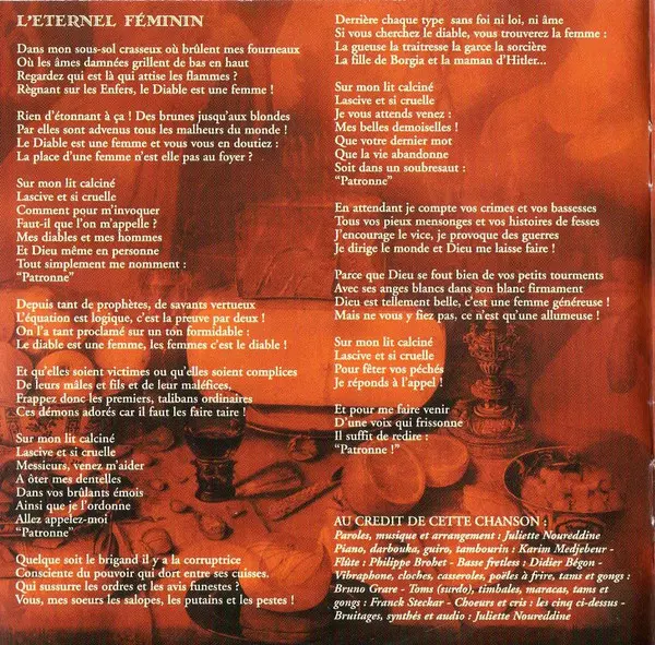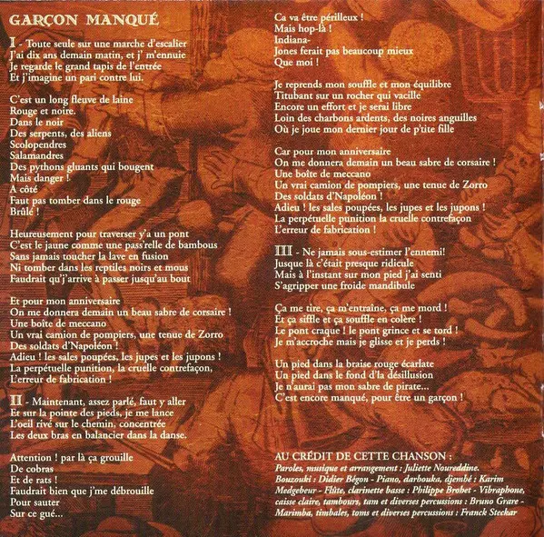Cymbal, Timbales, Percussion [Various] Franck Steckar | Flute, Clarinet, Bass Clarinet Philippe Brohet | Guitar Didier Bégon | Lyrics By, Music By, Arranged By Juliette Noureddine | Piano Karim Medjebeur | Synthesizer [Noises], Effects [Audio] Juliette Noureddine | Vibraphone, Bass Drum, Percussion [Various] Bruno Grare