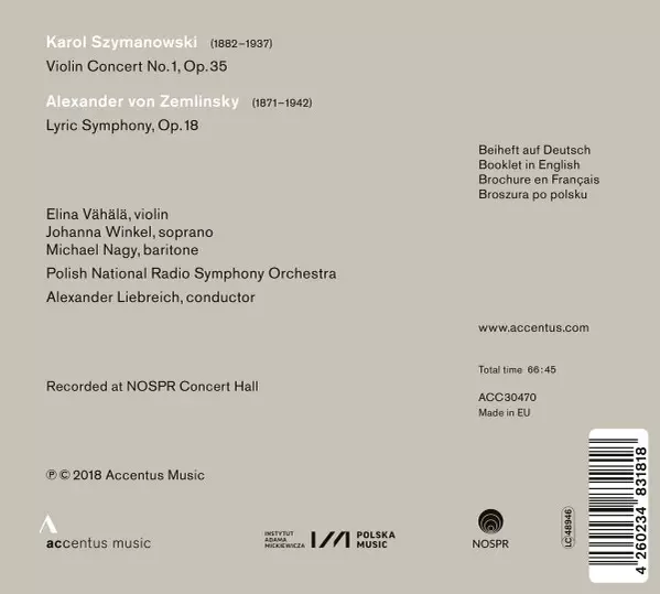 Künstler | Narodowa Orkiestra Symfoniczna Polskiego Radia | Karol Szymanowski | Alexander Von Zemlinsky | Alexander Liebreich | Johanna Winkel | Michael Nagy | Elina Vähälä |