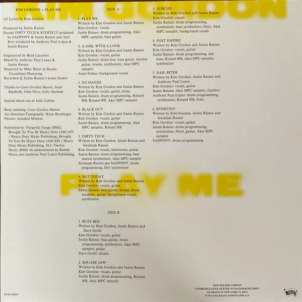 Drum Programming, Synthesizer, Drum Machine [Roland 808], Effects [Foley] Anthony Paul Lopez | Sampler [Akai MPC Sampler], Guitar [Fuzzbox] Justin Raisen | Vocals, Guitar Kim Gordon | Written-By Anthony Paul Lopez, Justin Raisen, Kim Gordon