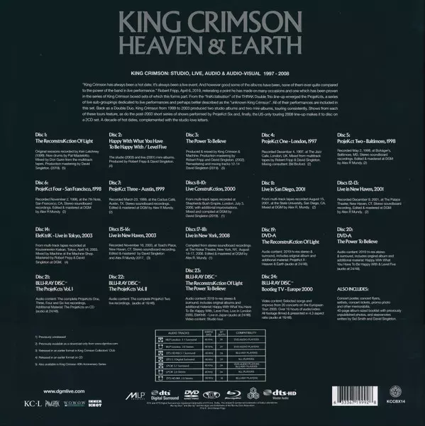 Heaven and Earth is King Crimson's most comprehensive box set to date, covering more than a decade of the band's history. It includes the most complete collection of concerts from Project 1-4 and all the studio recordings from Project 2, plus a wide selection of Project albums and related recordings. When the double trio of Fripp, Belew, Levin, ...