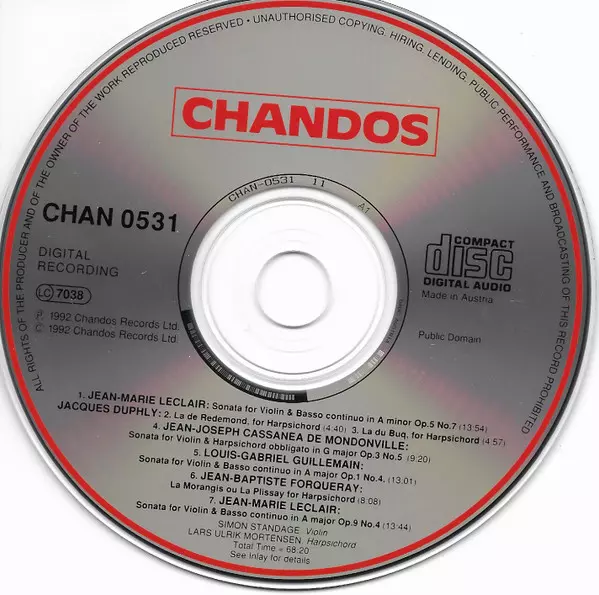 | Künstler | Jean Marie Leclair | Simon Standage | Lars Ulrik Mortensen | Jacques Duphly | Jean Joseph Cassanea De Mondonville | Jean-Baptiste Antoine Forqueray | Louis-Gabriel Guillemain |