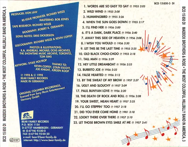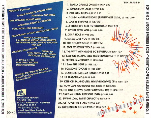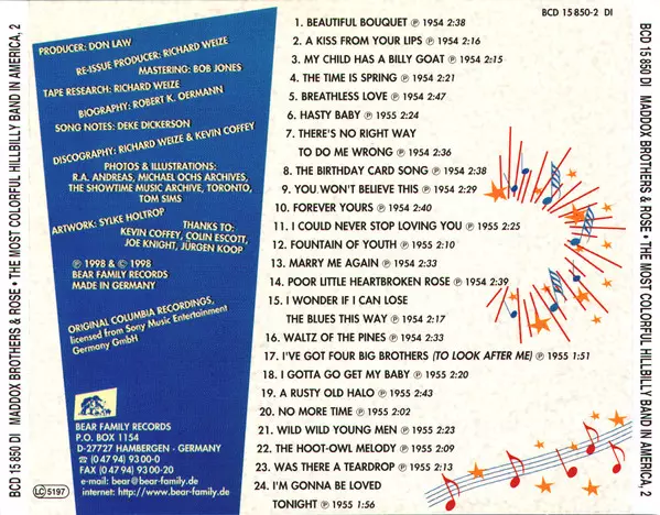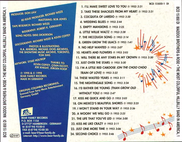 Maddox Brothers and Rose: The Most Colorful Hillbilly Band In America Die Version auf 4CD in Standard- Auflage. Diese besondere Auflage wurde veröffentlicht in Deutschland im Verlag Bear Family Records am 7. Mai 2021. Album Genres übergreifend Folk, World, & Country, Country, Hillbilly, Honky Tonk und Bakersfield Sound.