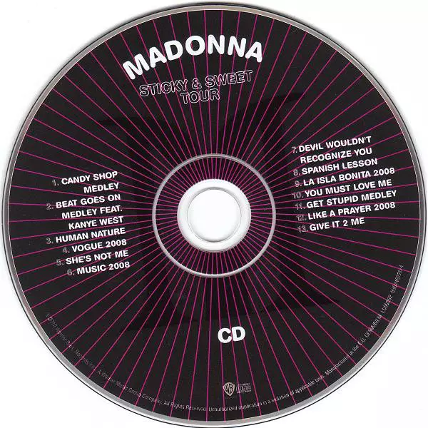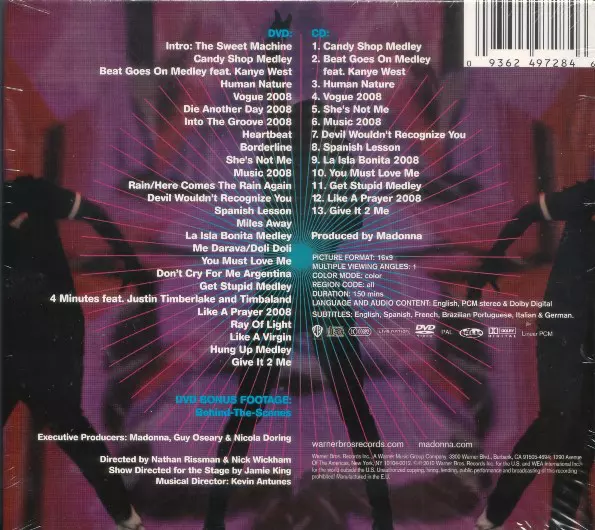 Madonna: Sticky & Sweet Tour DIGI Die Version auf CD/DVD in digipack Auflage. Diese besondere Auflage wurde veröffentlicht in Europa im Verlag Warner Bros. Records am 6. April 2010. Album Genres übergreifend Pop, Dance-pop, RnB/Swing und Europop. CD + DVD Digipack Dolby Digital.