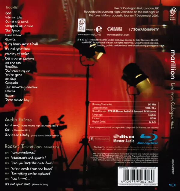 Marillion: Live From Cadogan Hall Die Version auf Blu-ray in Standard- Auflage. Diese besondere Auflage wurde veröffentlicht in Deutschland im Verlag Ear Music In Zusammenarbeit mit Racket Records (2) und Toward Infinity am 5. April 2011.