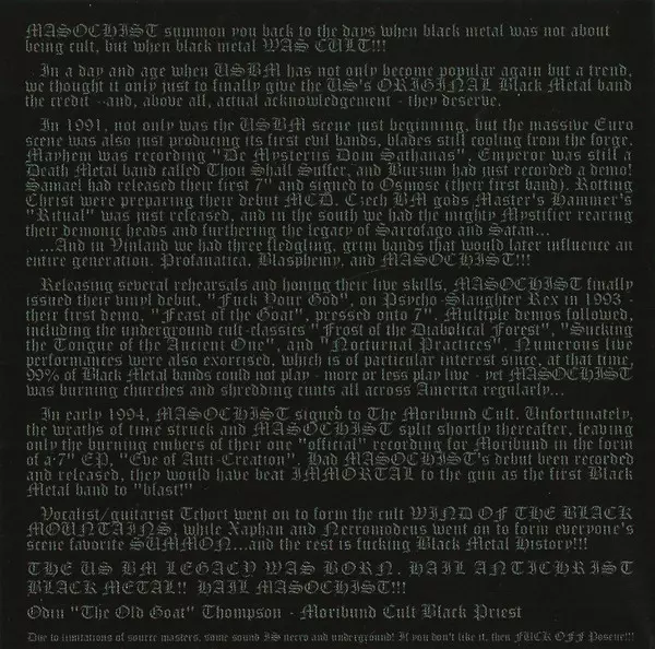 Masochist: History Die Version auf 2CD in limitierte Auflage. Diese besondere Auflage wurde veröffentlicht in USA im Verlag Moribund Records am 2. Juni 2009. Album Genres übergreifend Rock und Black Metal.